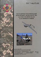 Методичні рекомендації командиру підрозділу по застосуванню БпАК тактичного рівня [Текст] : ВП 7-46(12).01 : військ. навч.-метод. публікація застосування БпАК тактичного рівня / Упр. безпілотної авіації штабу командування ПС ЗСУ. – [Київ, 2018]. – 65 с. : іл., табл. – Бібліогр.: с. 65 (10 назв). – У вих. дан.: вересень 2018. – Дод. 1-3.