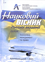 Науковий вісник Льотної академії [Текст] : зб. наук. праць / М-во освіти і науки України, Нац. авіац. ун-т, Льотна акад. Нац. авіац. ун-ту. – Кропивницький : [Льотна акад. НАУ], 2021. – 232 с. – (Серія: Економіка, менеджмент та право ; вип. 3, 4). – Бібліогр. в кінці ст.