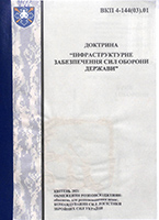 Доктрина «Інфраструктурне забезпечення Сил оборони держави» [Текст] : ВКП 4-144(03).01 : військ. кер. публ. / Командування Сил логістики ЗСУ. – [Київ], 2021. – 16 арк. – У вих. дан.: квітень 2021.