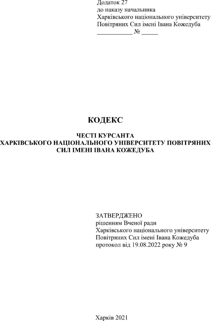 2. ОСНОВНІ МОРАЛЬНІ ЗАСАДИ КОДЕКСУ ЧЕСТІ КУРСАНТА ХАРКІВСЬКОГО НАЦІОНАЛЬНОГО УНІВЕРСИТЕТУ ПОВІТРЯНИХ СИЛ ІМЕНІ ІВАНА КОЖЕДУБА.